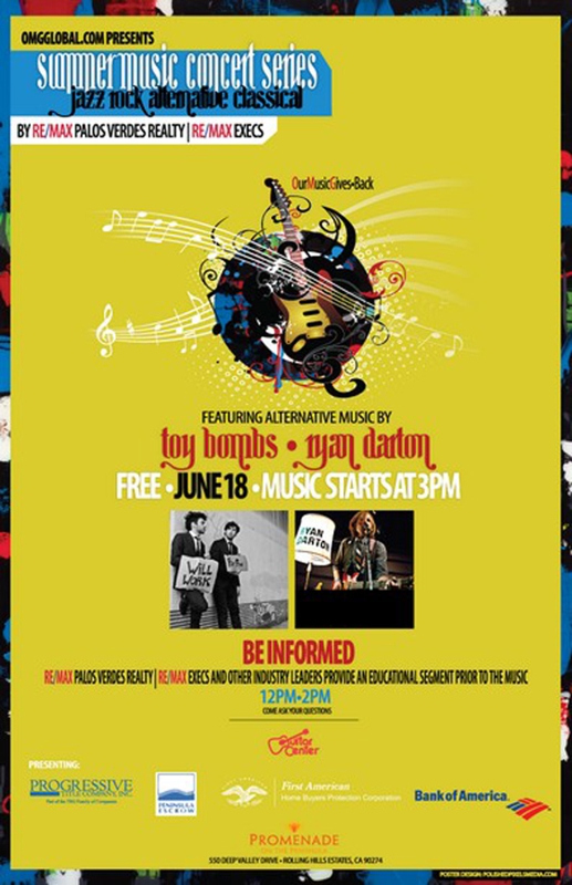There will be a free concert at the Promenade of the Peninsula shopping center next Sunday June 18th that is sponsored by Remax Palos Verdes Realty. The concert will begin at 3pm and features the music of Toy Bombs and Ryan Darton. In addition to the concert, there will also be some fun events for the family including a dog parade, pet adoptions, etc.