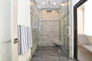 upscale; Add new 100-square-foot master bath to existing master bedroom over crawlspace. Include 42×42-inch neo-angle shower with ceramic tile walls, accent strip, recessed shower caddy, body-spray fixtures, and frameless glass enclosure. Put in freestanding soaker tub with high-end faucets; stone countertop with two sinks; two mirrored medicine cabinets with lighting; a compartmentalized commode area with one-piece toilet; and a humidistat-controlled exhaust fan. Use larger matching ceramic tiles on the floor, laid on diagonal with ceramic tile base molding. Add general and spot lighting and waterproof shower fixture. Cabinetry has custom drawer base, wall cabinets. Extend HVAC. Electric in-floor heating.