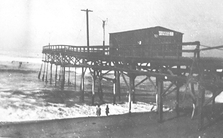 The Center street pier was believed to have been 900-feet long. Pylons were made by fastening three railroad rails together and driving them into the ocean floor. A narrow wooden deck was supported by these pilings. A wave machine was installed at the foot of the pier in order to generate electricity for the lighting system on the Strand but the plan did not work. The “old iron pier” as it was called, was destroyed by a major storm in 1913.