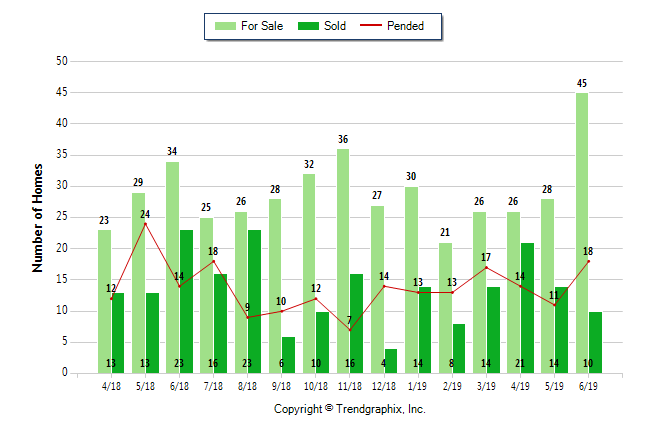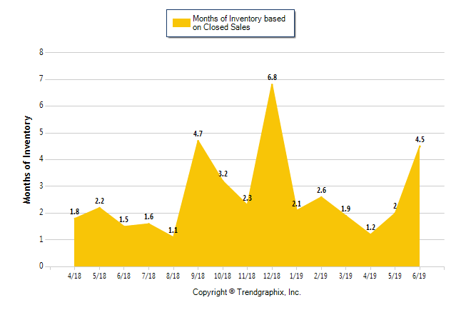 With 45 units for sale at the end of June and the average monthly sales over the last 3 months of 15 units sold equates to 3 months of inventory. The chart below is based upon the most recent months sales of only 10 units.